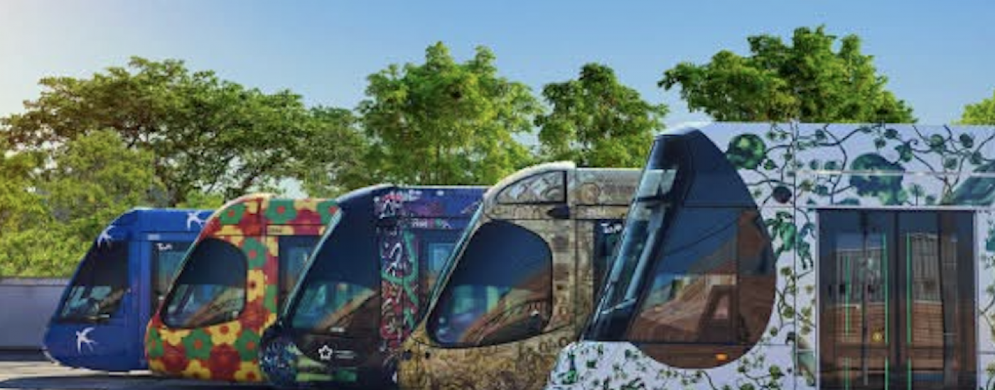 Launched in December 2025, Line 5 connects the west and north of Montpellier. It has 27 stations and two major stops at Gennevaux and Girac, where passengers can easily change modes of transport. It complements Lines 1, 2, 3, and 4 and allows passengers to travel throughout the city. Approximately 80,000 people will use it every day. Between Place Albert 1er and Saint Eloi, a tram will run every 2 to 3 minutes to offer passengers greater comfort. The green design of Line 5 is by Barthélémy Toguo. His work Feuille de vie (Leaf of Life) illustrates the union between man and the plant world, symbolizing the harmonious relationship between the individual and the elements that surround them.