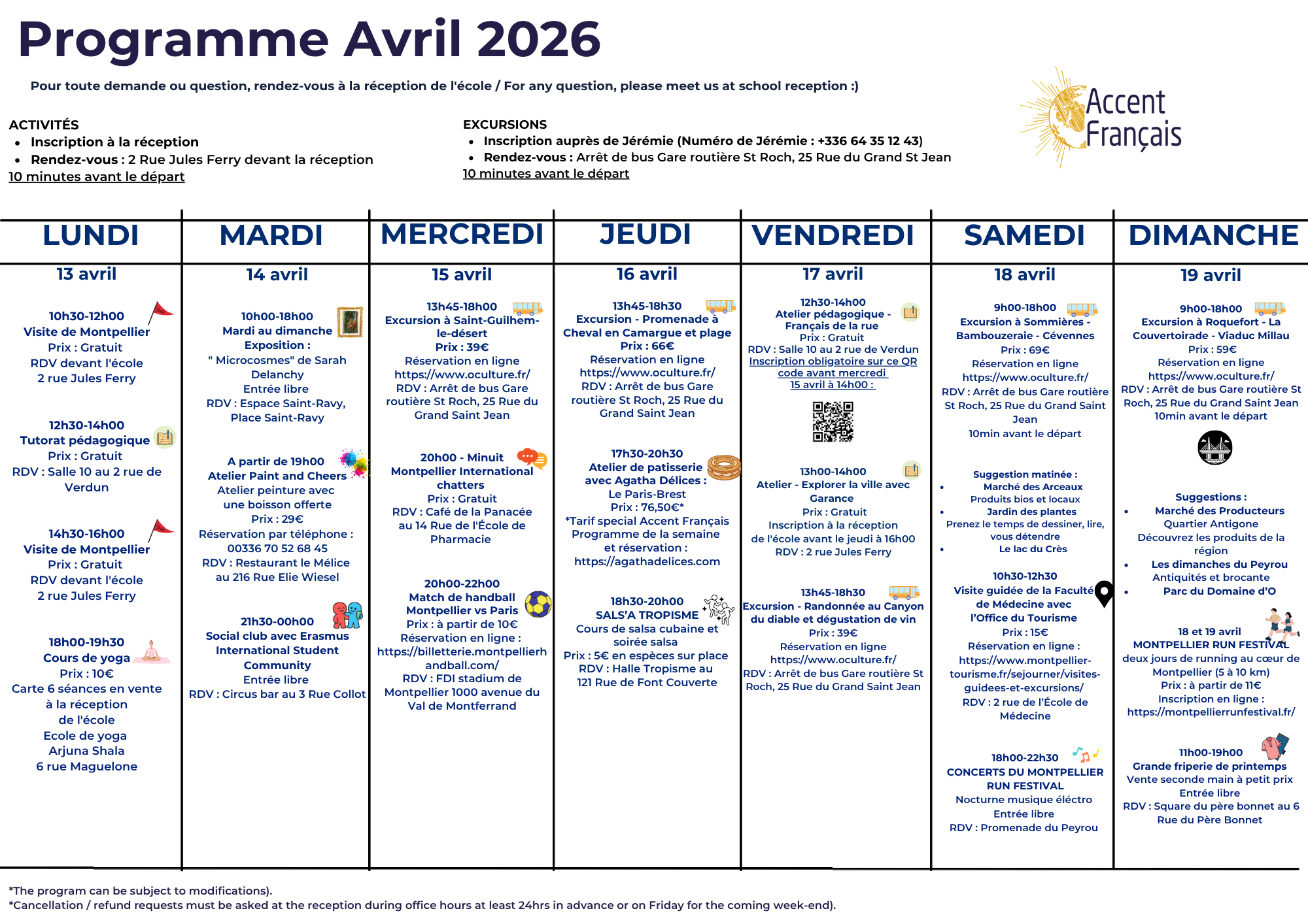 Programme d'activités de la semaine du 13 au 19 avril 2026