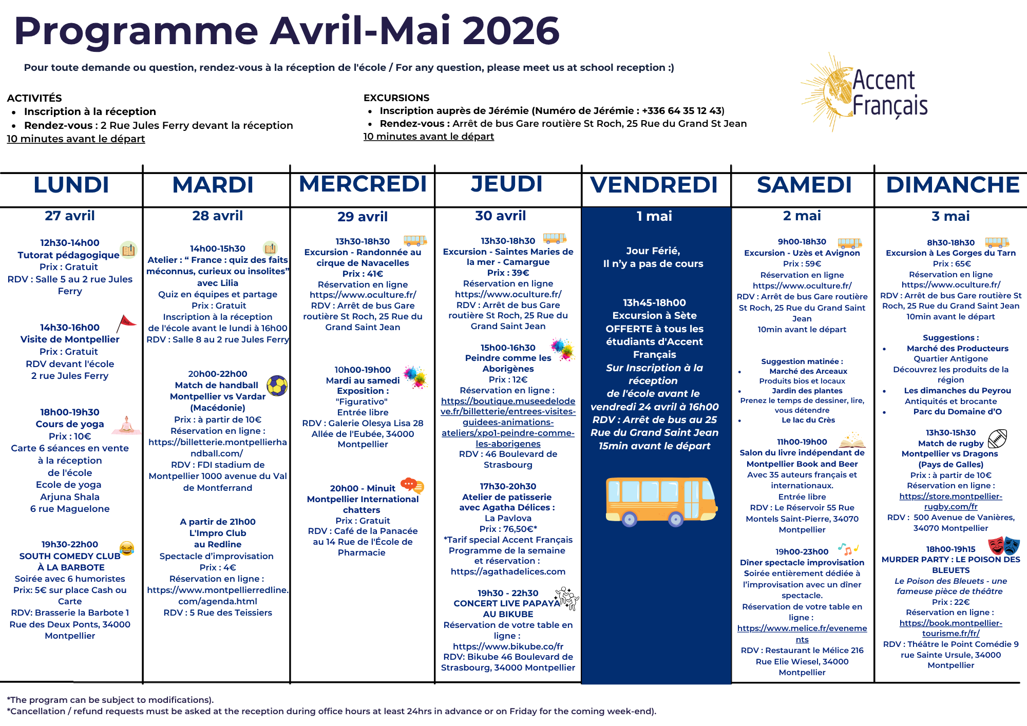 Programme d'activités de la semaine du 27 avril au 1er mai 2026